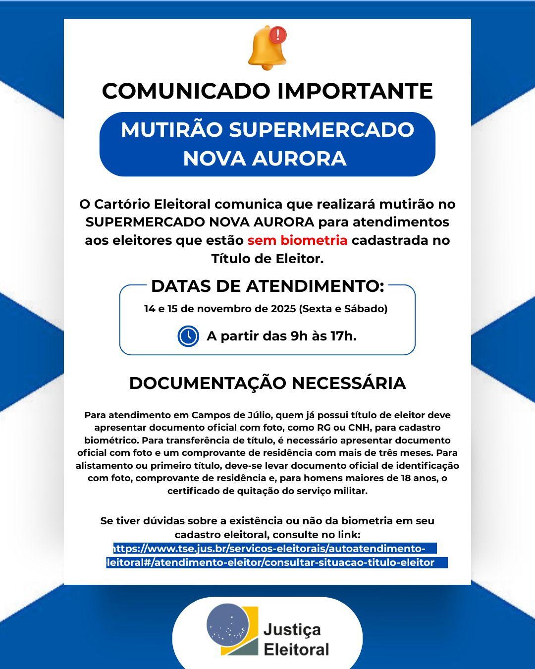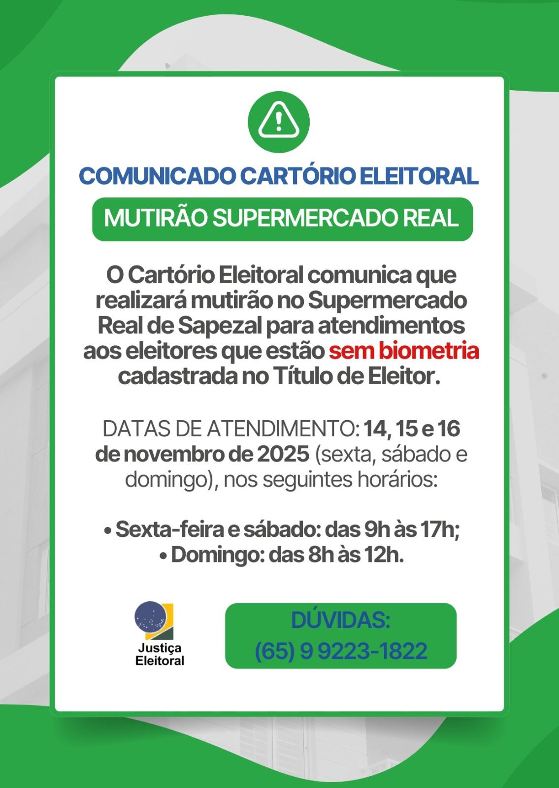 O Cartório Eleitoral anunciou a realização de dois mutirões de atendimento voltados aos eleitores que ainda não possuem a biometria cadastrada no Título de Eleitor. As ações ocorrerão em Sapezal e Campos de Júlio, com o objetivo de facilitar o acesso dos cidadãos ao serviço e evitar filas e deslocamentos até o cartório.